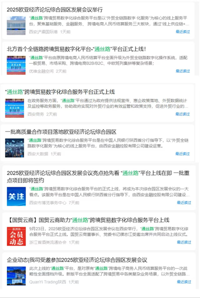 近日,由西安金融控股有限公司建設(shè)運營的“通絲路”跨境貿(mào)易數(shù)字化綜合服務(wù)平臺(以下簡稱“通絲路”平臺),在2025歐亞經(jīng)濟論壇綜合園區(qū)發(fā)展會議上正式提檔升級上線。此次上線是助力“一帶一路”貿(mào)易便利化的重大舉措,引發(fā)陜西日報、華商網(wǎng)、陜西新聞網(wǎng)、西部網(wǎng)、三秦網(wǎng)、今日頭條、搜狐新聞等媒體,以及西安商務(wù)、陜西自貿(mào)試驗區(qū)西安管委會、西安市博覽事務(wù)中心、西安浐灞國際港、西安大數(shù)據(jù)等微信公眾平臺相繼關(guān)注報道,相關(guān)話題迅速成為區(qū)域外貿(mào)領(lǐng)域關(guān)注焦點。