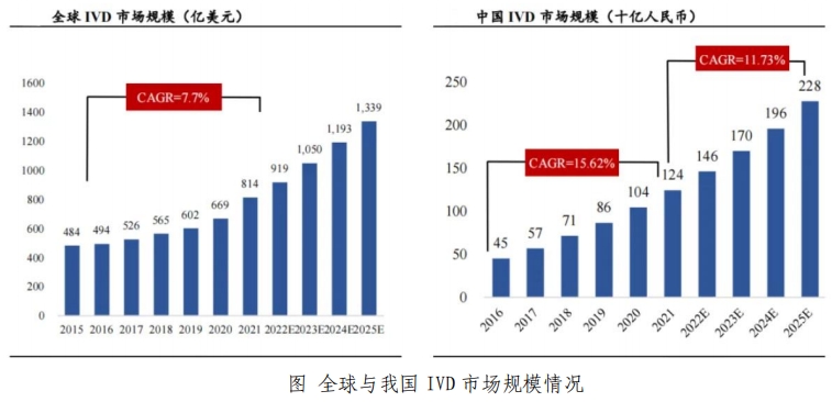 體外診斷是近年來醫(yī)療行業(yè)中發(fā)展最迅速、最活躍的子行業(yè)之一,目前在全球范圍內(nèi)已經(jīng)逐步成為規(guī)模顯著的成熟產(chǎn)業(yè)。隨著慢性病發(fā)病率增加及醫(yī)療技術(shù)和服務(wù)水平的提升,全球IVD市場規(guī)模預(yù)計(jì)在2025年將增長至1339億美元,2022-2025E年復(fù)合增長率約為9.9%,實(shí)現(xiàn)加速擴(kuò)張。