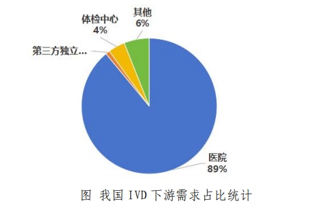 IVD產(chǎn)品通過直銷、經(jīng)銷渠道銷往醫(yī)院、政府和第三方檢測中心等下游客戶,目前以醫(yī)院為主,終端消費(fèi)群體為廣大患者及需要健康檢測的人群。其中,醫(yī)院是體外診斷行業(yè)最大的下游需求端,占總市場規(guī)模的89%,第三方獨(dú)立實(shí)驗(yàn)室占比約1%,體檢中心市場占比4%,其他領(lǐng)域需求占比6%。