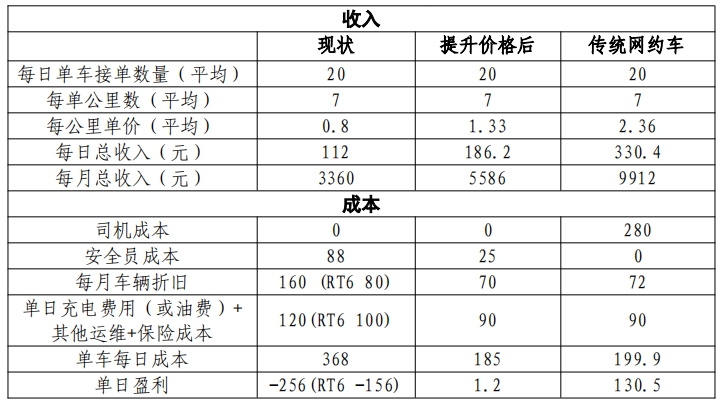 第六代無人車RT6,指導價為20.46萬元,蘿卜快跑后續(xù)的降本空間主要在于進一步降低車輛成本與安全員成本。新一代RT6對應折舊成本可降低一半,假設后續(xù)通過提高安全員的人車比例,使安全員成本降低至目前1/3,不考慮研發(fā)費用和前期固定成本,蘿卜快跑平均單價1.33 元/km,即可實現(xiàn)盈虧平衡。