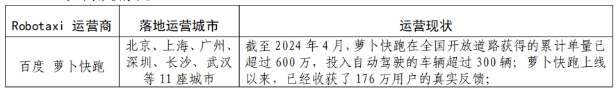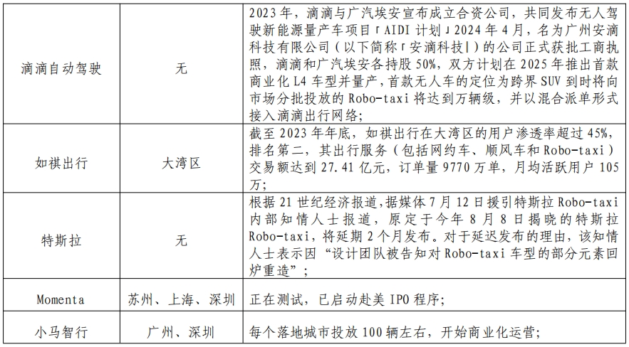 隨著技術的成熟,目前各大科技巨頭都在加快“Robo-taxi”商業(yè)化落地的步伐,搶占“風口”。百度蘿卜快跑落地運營11座城市,截至今年4月訂單超600萬;滴滴、如祺出行、小馬智行等也在布局“Robo-taxi”;根據(jù)21世紀經(jīng)濟報道,特斯拉原計劃8月8號揭曉“Robo-taxi”;科技巨頭爭相布局,助推“Robo-taxi”商業(yè)進程加速。下表為目前國內(nèi)“Robo-taxi”運營商及情況:
