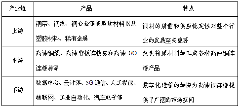 高速銅連接行業(yè)的上游主要是各種原材料的供應(yīng);中游是銅連接產(chǎn)品的生產(chǎn)制造,主要由專業(yè)的連接器制造商承擔(dān);下游是終端應(yīng)用領(lǐng)域,主要包括數(shù)據(jù)中心、通信基站、云計(jì)算、工業(yè)自動(dòng)化、醫(yī)療設(shè)備、汽車電子等方面。