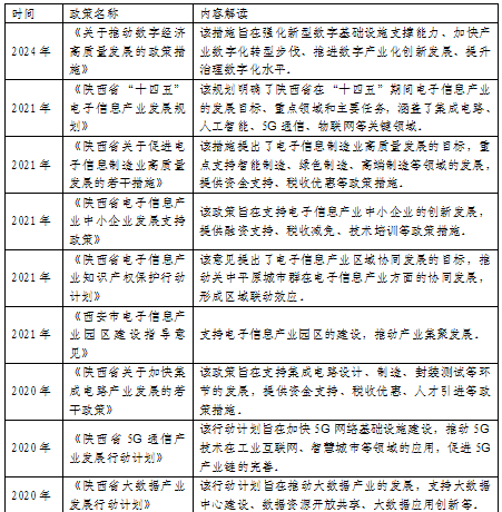 西安是我國中西部發(fā)展的核心城市之一,亦是我國電子信息產(chǎn)業(yè)的領軍城市,“十一五”期間,電子信息產(chǎn)業(yè)就被西安市政府認定為重點發(fā)展的高新技術產(chǎn)業(yè)之一;2020年,電子信息產(chǎn)業(yè)正式被列入西安市六大支柱產(chǎn)業(yè)之中;2021年,西安市明確提出了電子信息產(chǎn)業(yè)2025年的發(fā)展目標;2024年,陜西省政府發(fā)布《關于推動數(shù)字經(jīng)濟高質量發(fā)展的政策措施》,為產(chǎn)業(yè)發(fā)展提供了有力支持。本文列舉重要政策文件如下。