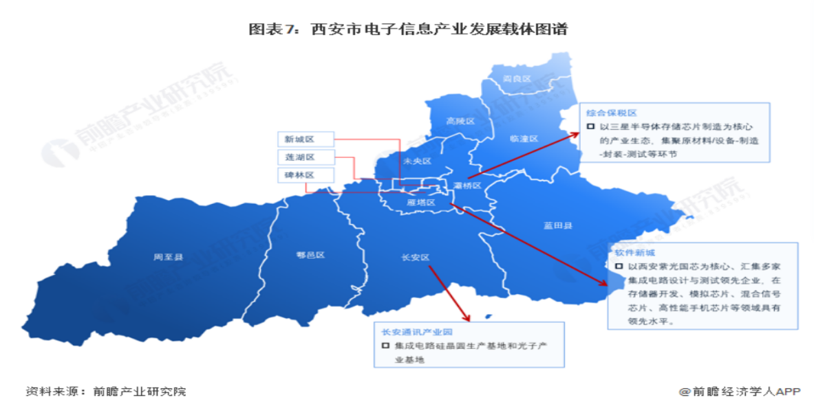 西安高新區(qū)、西安軟件園、西安集成電路產(chǎn)業(yè)基地是電子信息企業(yè)的主要集聚區(qū)。2012年三星最大的閃存芯片生產(chǎn)基地落地西安以來,龍頭企業(yè)的輻射作用使得全產(chǎn)業(yè)鏈逐步得到完善。