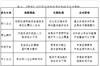 《新規(guī)》的出臺標志著中國供應鏈金融從“規(guī)模擴張”轉(zhuǎn)向“質(zhì)效并重”的新發(fā)展階段。短期來看,電子憑證業(yè)務整頓、核心企業(yè)責任強化將重塑行業(yè)競爭格局,約23%的存量憑證(9.6萬億元)面臨調(diào)整,科技平臺盈利模式亟待重構;中長期則通過技術賦能和制度創(chuàng)新,推動行業(yè)從“信用中介”向“信息樞紐”、從“核心依賴”向“生態(tài)共贏”轉(zhuǎn)型。
