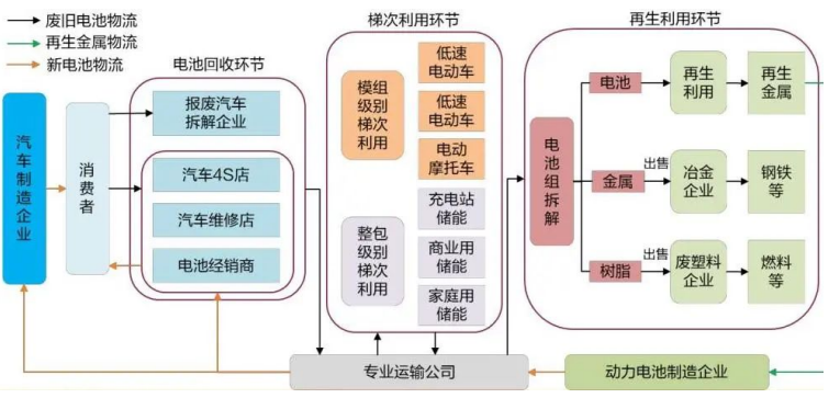 從產(chǎn)業(yè)鏈角度來(lái)講,動(dòng)力電池回收與綜合利用行業(yè)分為梯次利用產(chǎn)業(yè)鏈和再生利用產(chǎn)業(yè)鏈。當(dāng)動(dòng)力電池容量衰減至初始容量的80%以下時(shí),電池或不再適合電動(dòng)汽車使用,但可在儲(chǔ)能系統(tǒng)(電網(wǎng)調(diào)峰調(diào)頻、削峰填谷、風(fēng)光儲(chǔ)能等)、低速電動(dòng)工具等場(chǎng)景中實(shí)現(xiàn)二次利用,即梯次利用;當(dāng)電池容量衰減至初始容量的40%以下時(shí),則可通過(guò)拆解回收,提取其中的鋰、鈷、鎳等高價(jià)值金屬材料,實(shí)現(xiàn)資源再生利用。所以梯次利用產(chǎn)業(yè)鏈的上游主要為電池材料企業(yè),中游包括電池生產(chǎn)制造企業(yè)、儲(chǔ)能企業(yè)、電池綜合服務(wù)企業(yè),下游則是電池再利用領(lǐng)域的通信企業(yè)、低速電動(dòng)生產(chǎn)企業(yè)等;對(duì)于再生利用產(chǎn)業(yè)鏈,其上游主要是電池生產(chǎn)制造企業(yè),中游是提供回收渠道的物流企業(yè)、環(huán)保企業(yè)及電池檢測(cè)企業(yè),下游則是電池材料企業(yè)。