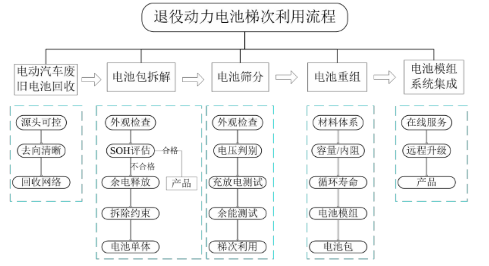 動(dòng)力電池的梯次利用實(shí)際屬于輕度報(bào)廢,經(jīng)過(guò)拆解、測(cè)試、分類、重組等過(guò)程后重新分檔使用在對(duì)電池能量密度要求不高的場(chǎng)景當(dāng)中。