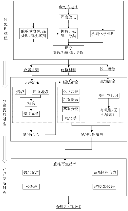 動(dòng)力電池拆解回收,即將廢舊電池進(jìn)行物理或化學(xué)拆解,提取其中的金屬或化合物,進(jìn)行精煉或再生利用。不同于廢舊電池梯次利用存在商業(yè)化進(jìn)展緩慢,經(jīng)濟(jì)性、安全性面臨較大挑戰(zhàn)等問(wèn)題,動(dòng)力電池拆解回收工藝已經(jīng)較為成熟,主要可以分為預(yù)處理、分離提?。ㄉ疃忍幚恚?、產(chǎn)品制備等過(guò)程。